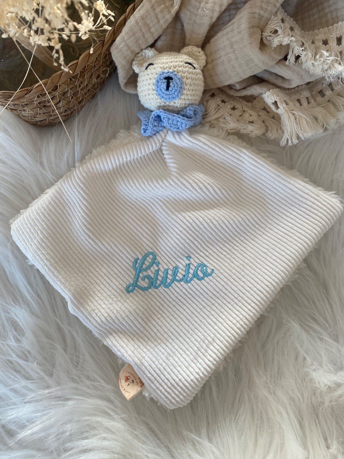 Avec sa tête d’ourson blanc cassé au crochet et son nez bleu délicat, ce doudou bébé personnalisé accompagne votre enfant dès la naissance pour :