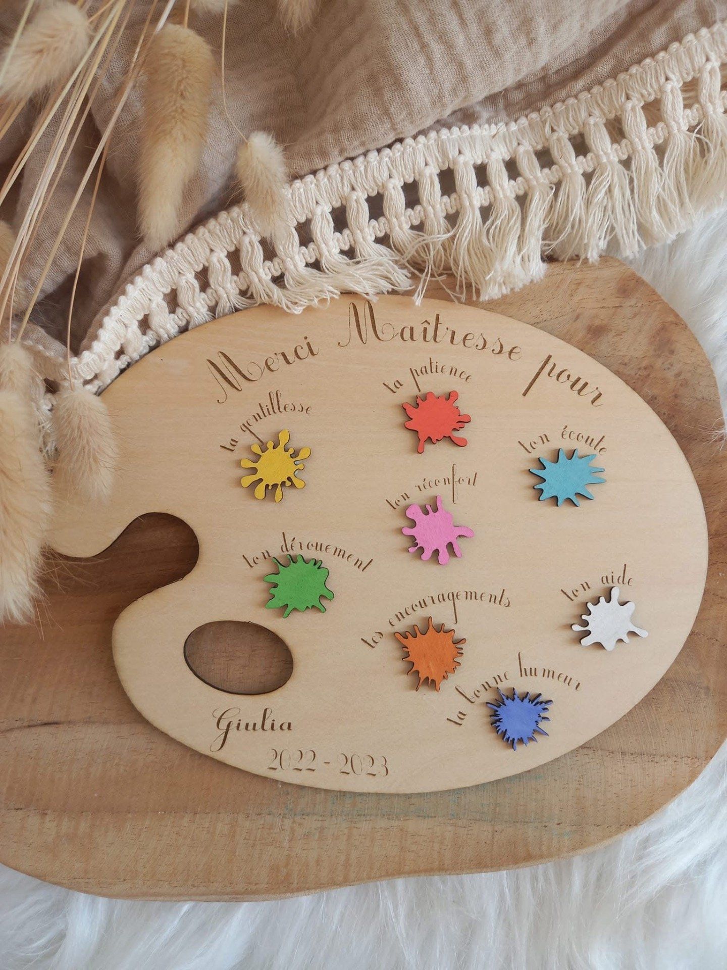 Offrez un souvenir unique et plein d’émotion avec cette magnifique palette en bois personnalisée, pensée comme un véritable hommage à une année scolaire remplie de douceur 💛